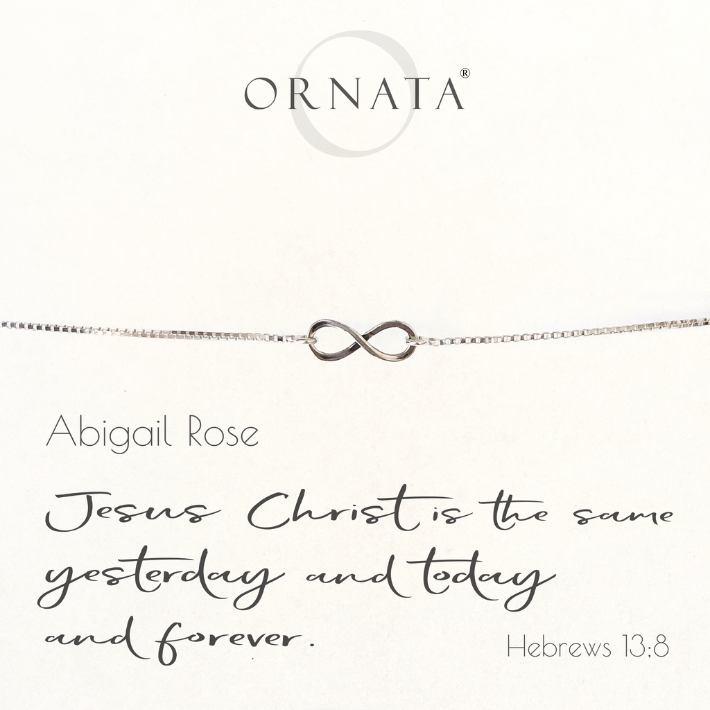 "HEBREWS 13:8" INFINITY STERLING SILVER BOLO BRACELET ON PERSONALIZED JEWELRY CARD