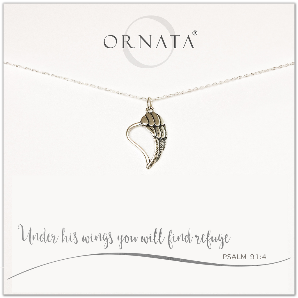 "Psalm 91:4” STERLING SILVER ANGEL WING HEART CHARM NECKLACE ON PERSONALIZED JEWELRY CARD